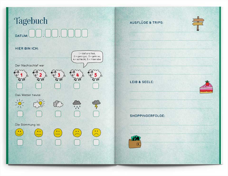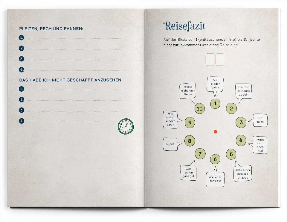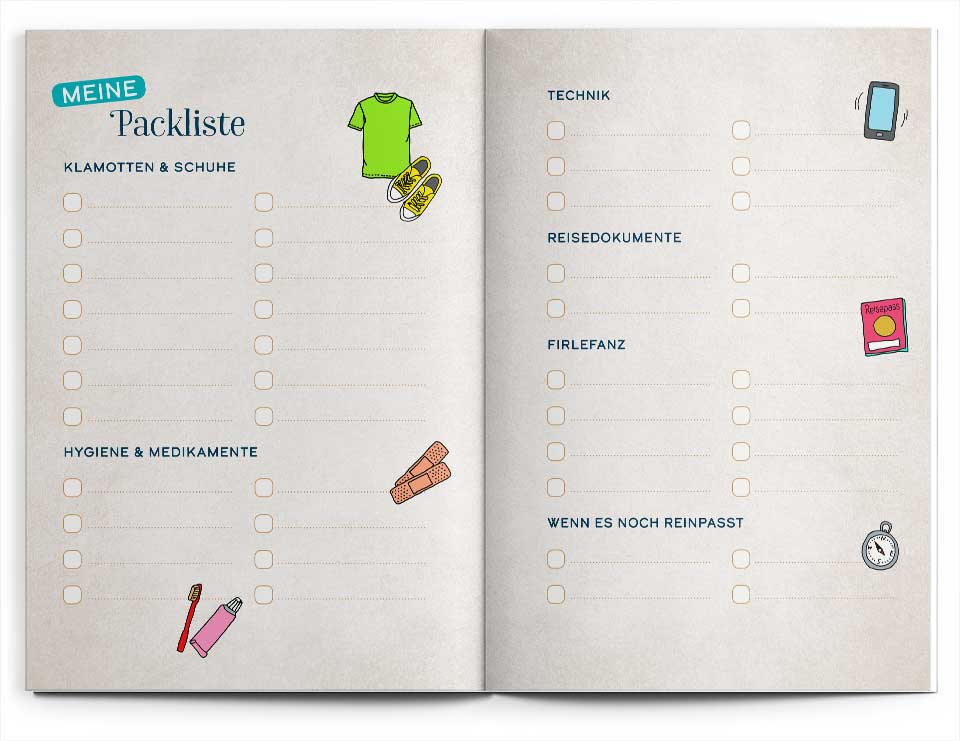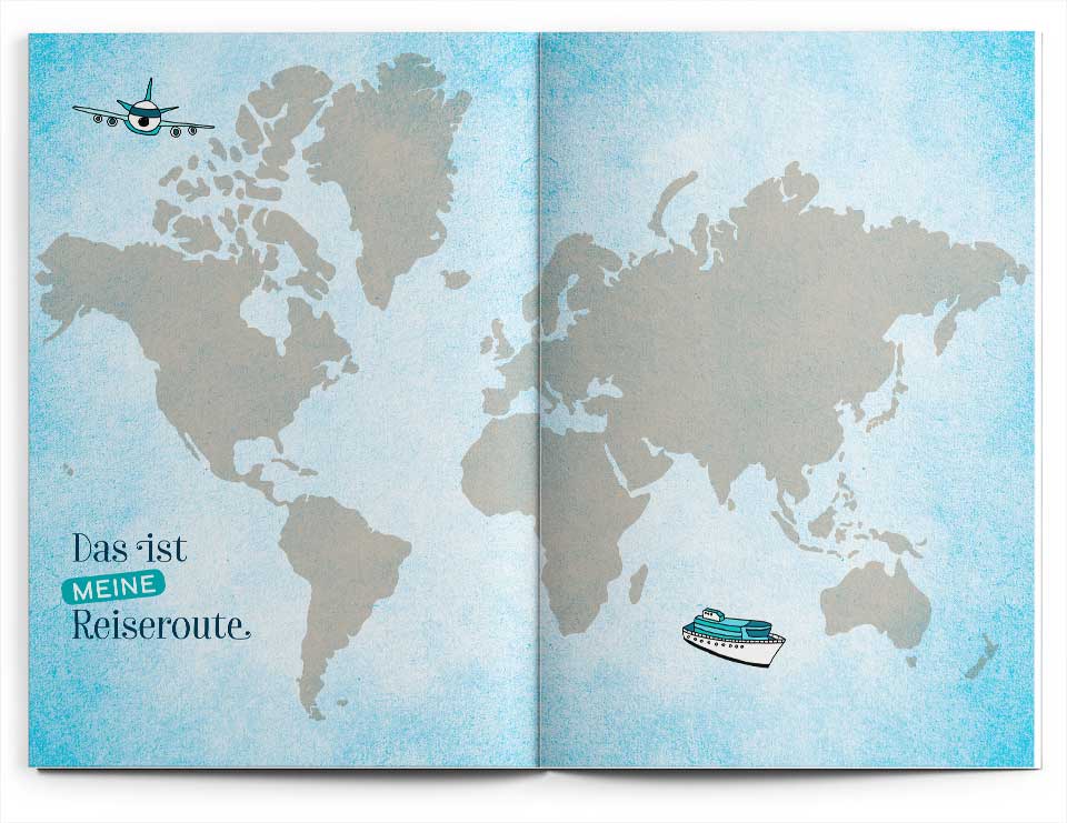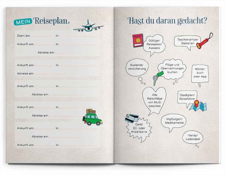 Ein Eintragbuch für die Reise – mit Plänen und Checklisten zur Vorbereitung, einem Tagebuchteil zum festhalten des Reiseverlaufs und mit Platz für Rückblick und Fazit. Es waren verschiedene Seitenvarianten zu gestalten, die sich teilweise im Buch wiederholen, dazu wurden einfache Illustrationen angefertigt.