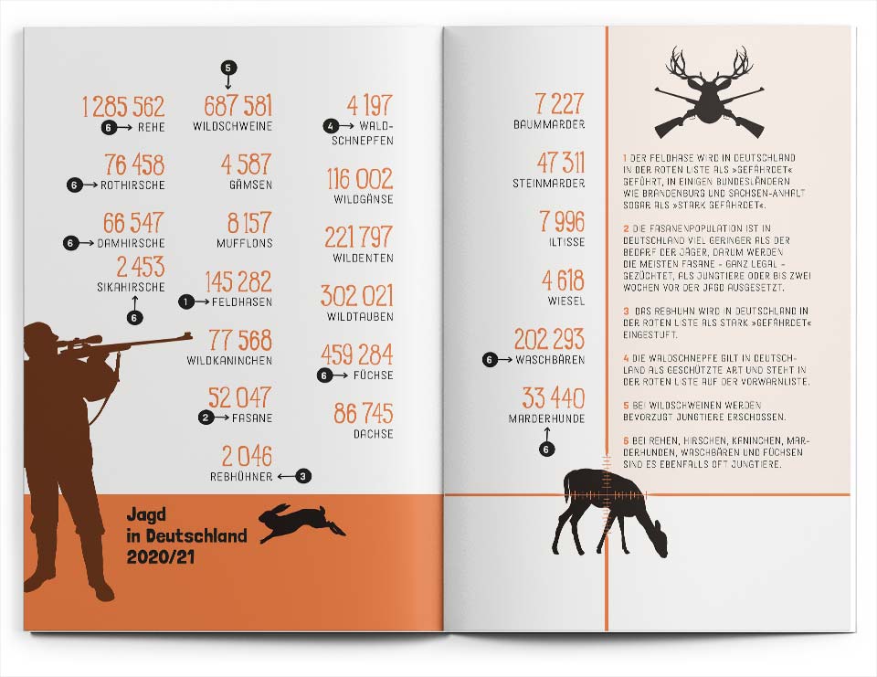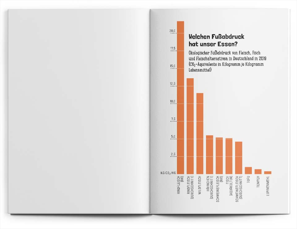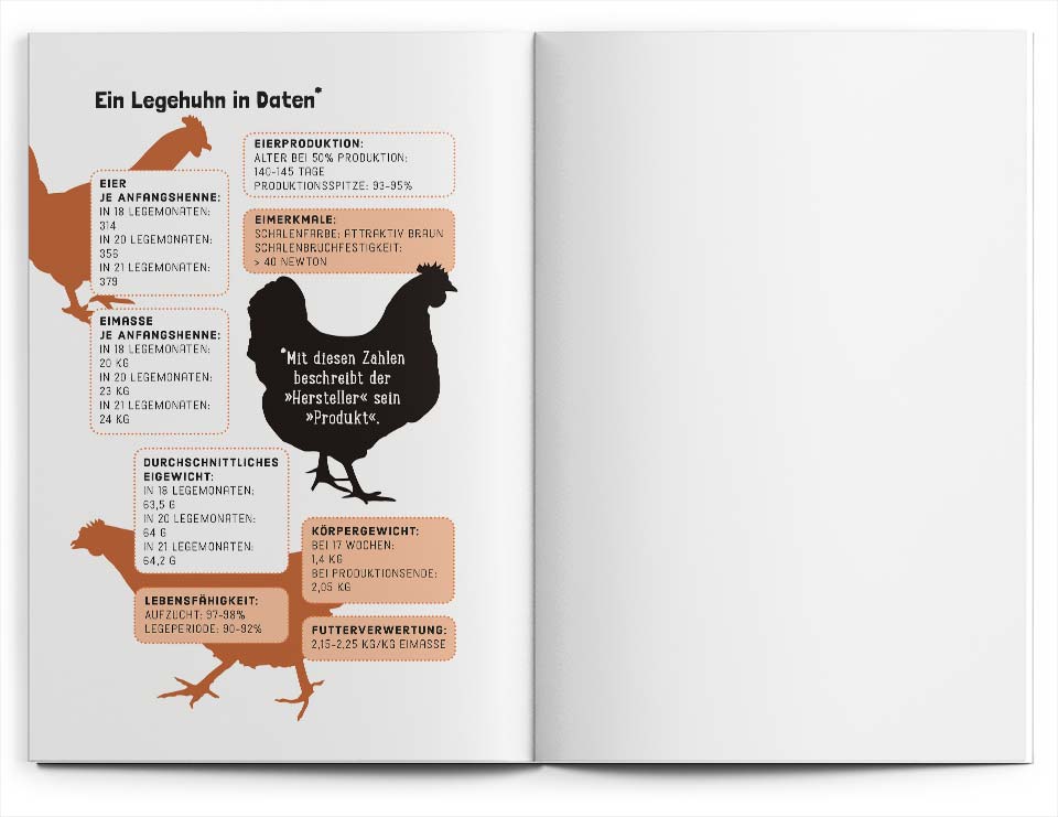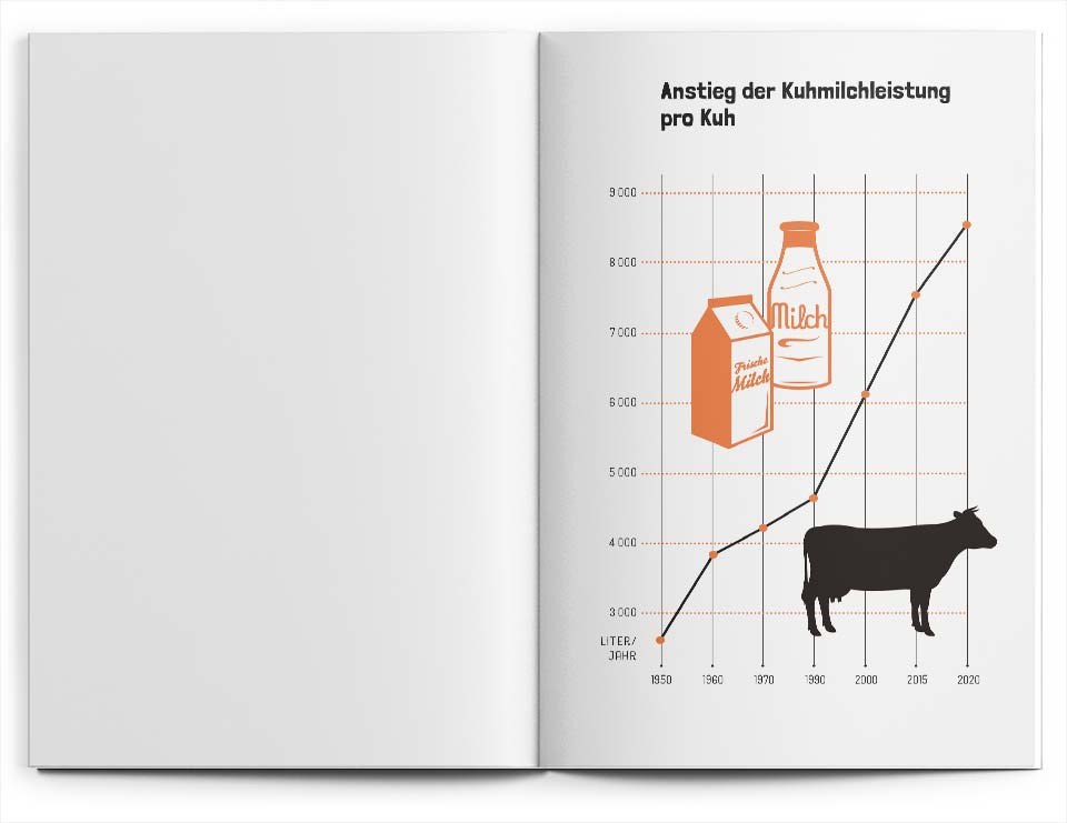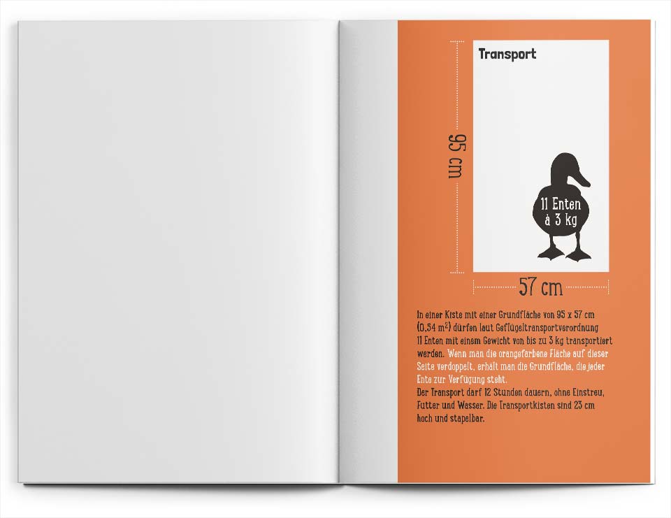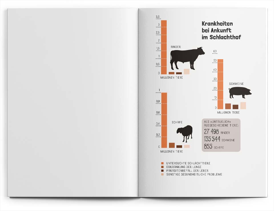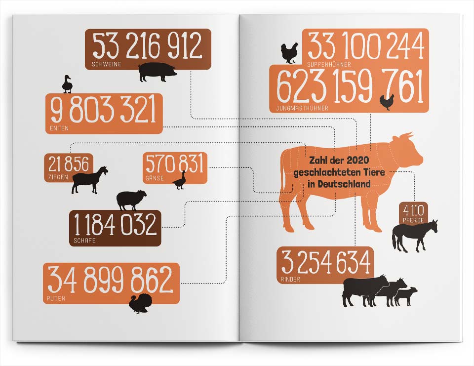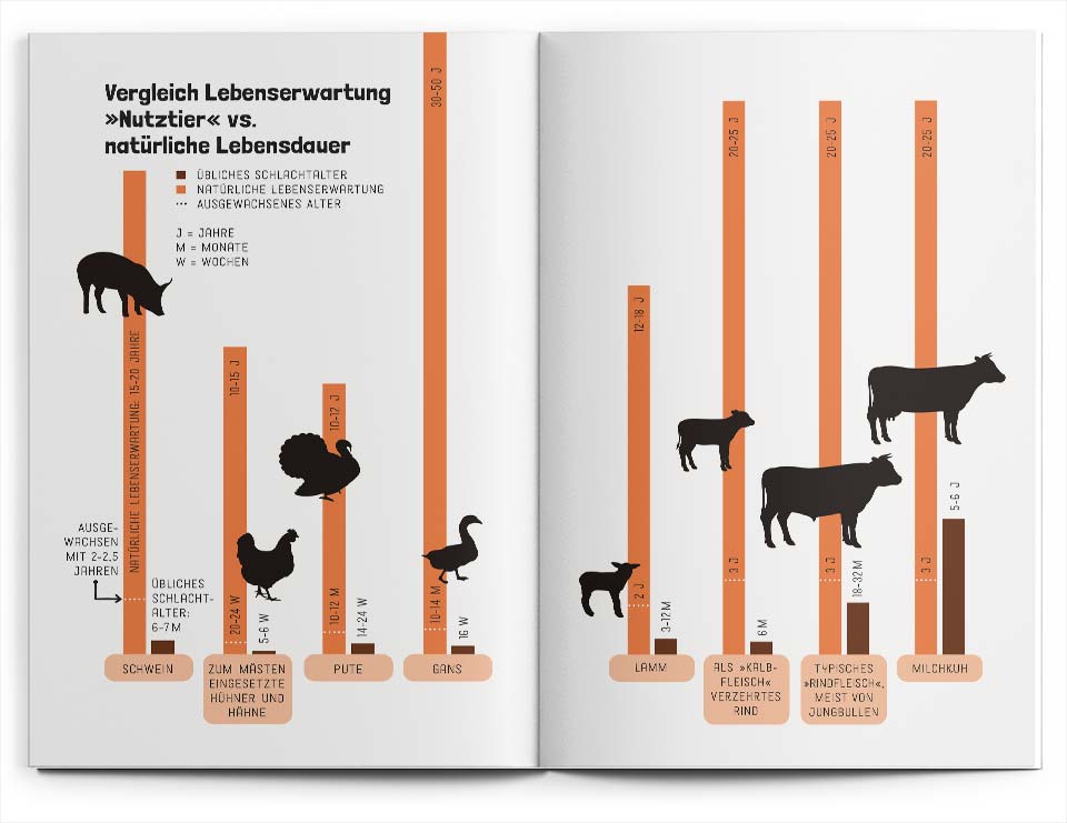 »… Das Prinzip von Rede und Gegenrede findet immer wieder visuelle Bezugspunkte in den zweifarbigen grafischen Infotafeln, die in ganzseitigen, plakativen Kompositionen und ganz auf die Sache konzentriert einen großen Beitrag zur Einsicht leisten. Gedankliche Widerstände des Lesers werden durch die Grafiken immer wieder auf die Sache zurückgebogen. Kein einziges reißerisches Quälbild, überhaupt kein Foto von Tieren ist nötig, um die Drastik der Fakten sprechen zu lassen …«
